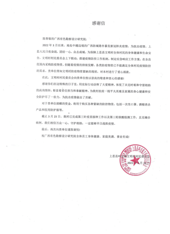 近日,我院收到一封来自上思县叫安镇文明村村民委员会的感谢信,信中表示感谢该院齐心协力抗疫情,同舟共济克难关。