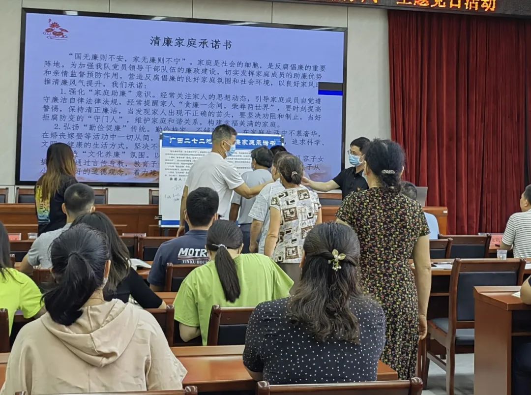 接下来,大会进入了签订廉政家庭承诺书的环节。全体党员干部纷纷主动走上前台,自愿在廉政家庭承诺书上签下了自己的名字。承诺书的签订,有效增强了全体党员干部从业履职的神圣感与责任感,提高了党员干部廉洁自律意识和拒腐防变的能力,为基层党组织全面落实党风廉政建设责任制提供了有力的保障。